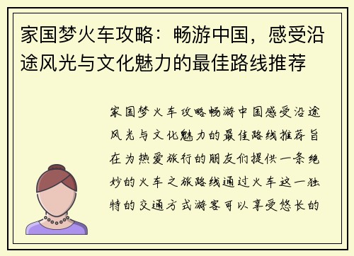 家国梦火车攻略:畅游中国,感受沿途风光与文化魅力的最佳路线推荐